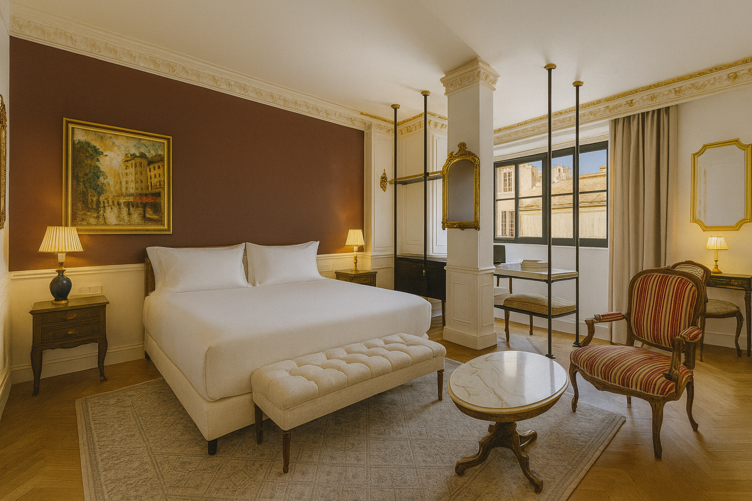 The France Room embodies the refined elegance of a Parisian haussmann-style interior. A king-size bed with a tufted headboard, soft cream tones, and classic wall mouldings create a warm, sophisticated atmosphere.
